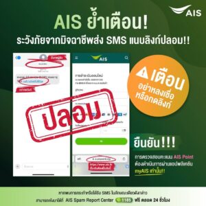 AIS เตือนลูกค้า ระวังมิจฉาชีพ ส่ง SMS ลวงแอบอ้าง มีลิงก์ไปเว็บไซต์ปลอม เตือน!! ห้ามคลิกเด็ดขาด ยืนยันไม่มีนโยบายส่ง SMS ให้ลูกค้ากรอกข้อมูลส่วนตัว 08/09/2024