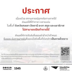 ไปรษณีย์ไทย แจ้งมาตรการรองรับสถานการณ์น้ำท่วม เดินหน้าส่งต่อบริการถึงมือประชาชน พร้อมแจ้ง 5 จังหวัดที่ปิดทำการชั่วคราว 26/11/2025