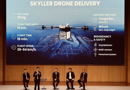 – บริษัท สไกลเลอร์ โซลูชั่นส์ จำกัด : สาธิตการบินโดรน ส่งอุปกรณ์ เครื่องกระตุกหัวใจไฟฟ้าอัตโนมัติ (Automated External Defibrillator, AED) จากไอคอนสยามข้ามแม่น้ำเจ้าพระยาไปยังริเวอร์ ซิตี้ แบงค็อก กรุงเทพมหานคร