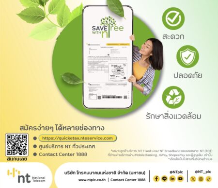 บริษัท โทรคมนาคมแห่งชาติ จำกัด (มหาชน) หรือ NT เชิญชวนผู้ใช้บริการยุค Green & Digital ที่ใส่ใจสิ่งแวดล้อม สมัครรับ e-Bill/e-Receipt/e-Tax Invoice ผ่านระบบ NT Quick e-Tax รองรับผู้ใช้บริการประเภทบุคคลธรรมดาที่ใช้บริการ NT Fixed Line /NT Broadband ของเลขหมาย NT (TOT) และชำระค่าบริการผ่านMobile Banking , mPay , ShopeePay และตู้บุญเติม ที่ต้องการความสะดวกสบายในการรับใบแจ้งหนี้ ใบเสร็จรับเงิน และใบกำกับภาษีจากการใช้บริการ (e-Bill/e-Receipt/e-Tax Invoice) ในช่องทางอิเล็กทรอนิกส์ โดยสามารถดำเนินการด้วยตนเองผ่านทาง NT Quick e-tax