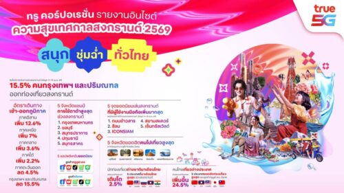 ทรู คอร์ปอเรชั่น เผยอินไซต์ “ความสุขเทศกาลสงกรานต์ 2569” ผ่านการวิเคราะห์ข้อมูล “Mobility Data” จากโครงข่ายอัจฉริยะที่ขับเคลื่อนด้วย AI สะท้อนพฤติกรรมการเดินทางและการใช้งานดิจิทัลของผู้บริโภคแบบเรียลไทม์ พบว่าเทศกาลปีนี้มีการเดินทางกระจายตัวมากขึ้นทั่วประเทศ โดยเฉพาะภูมิภาคอีสานที่เติบโตสูงสุด ขณะที่นักท่องเที่ยวต่างชาติยังคงเพิ่มขึ้นต่อเนื่อง โดยเฉพาะนักท่องเที่ยวจีนที่ครองอันดับหนึ่ง