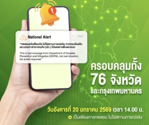 AIS ขอแจ้งให้ประชาชนทราบว่า กรมป้องกันและบรรเทาสาธารณภัย (ปภ.) มีกำหนดทดสอบระบบแจ้งเตือนภัยผ่านโทรศัพท์มือถือด้วยเทคโนโลยี Cell Broadcast ในระดับประเทศ วันอังคารที่ 20 มกราคม 2569 เวลา 14.00 น. ครอบคลุมพื้นที่ 76 จังหวัดและกรุงเทพมหานคร เพื่อยืนยันความพร้อมของระบบเตือนภัยระดับชาติให้สามารถส่งข้อความได้รวดเร็ว ครอบคลุม และแม่นยำมากยิ่งขึ้น
