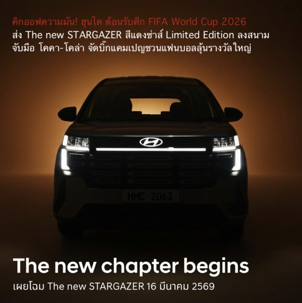 บริษัท ฮุนได โมบิลิตี้ (ประเทศไทย) จำกัด และ โคคา-โคล่า เดินหน้าสานต่อพลังความร่วมมือสู่แคมเปญ “โค้กเปิดฟีลซ่าส์ พาลัดฟ้าเชียร์ FIFA World Cup™” เพื่อร่วมจุดประกายบรรยากาศการแข่งขันและปลุกพลังแฟนบอลไทยก่อนทัวร์นาเมนต์ระดับโลกจะเริ่มต้นอย่างเป็นทางการ แคมเปญครั้งนี้จัดเต็มด้วยรางวัลมากมาย โดยมีไฮไลต์สำคัญคือ The new STARGAZER โฉมใหม่ล่าสุด รถ 6 ที่นั่ง 3 แถว ออฟชันความปลอดภัยครบที่สุดในคลาส รุ่น Limited Edition หนึ่งเดียวในประเทศไทย ที่ได้รับการคัสตอมพิเศษสำหรับกิจกรรมนี้โดยเฉพาะ และถือเป็นการเผยโฉม ก่อนการเปิดตัวอย่างเป็นทางการ ความร่วมมือดังกล่าวสะท้อนการผสานศักยภาพของสองแบรนด์ระดับสากลในฐานะ FIFA Partners เพื่อยกระดับการมีส่วนร่วมของแฟนบอลไทย พร้อมสร้างประสบการณ์แบรนด์ที่เชื่อมโยงกีฬา ไลฟ์สไตล์ และนวัตกรรมยานยนต์เข้าด้วยกันอย่างลงตัว