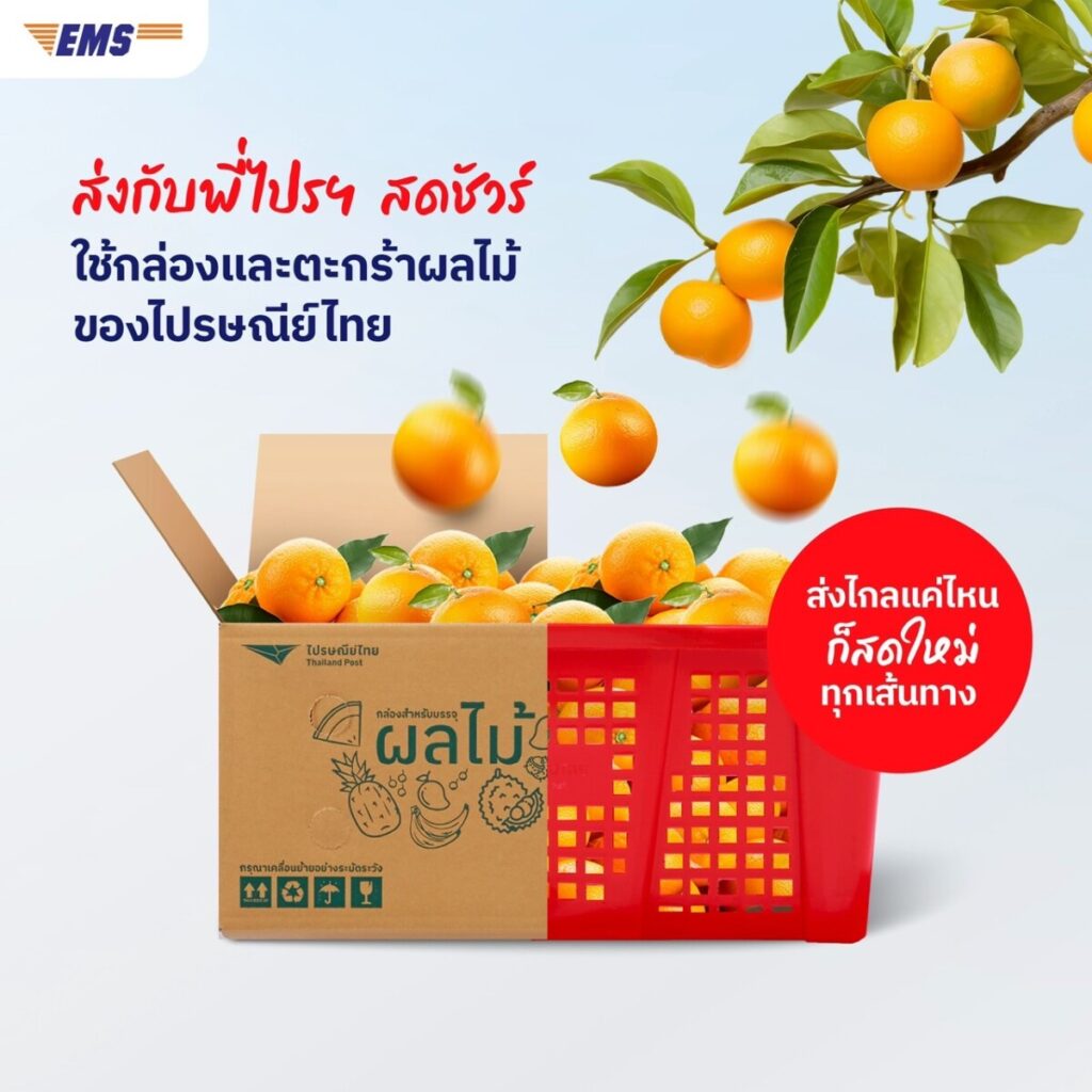 บริษัท ไปรษณีย์ไทย จำกัด พร้อมสนับสนุนเกษตรกรและคนไทยทั่วทุกภูมิภาค ส่งต่อผลไม้คุณภาพดี สดจากสวนด้วยบริการ EMS ส่งด่วนผลไม้ ถึงมือผู้บริโภคทั่วไทยอย่างรวดเร็ว และปลอดภัย รองรับความต้องการส่งหลากหลายรูปแบบ ทั้งแบบรายชิ้นและเหมากระบะ / Roll Pallet ที่ส่งได้สูงสุดถึง 200 กก. แนะนำผู้ส่งผลไม้ด้วยทริคง่ายๆ 4 ข้อ เพื่อส่งผลไม้ด่วนถึงมือผู้รับ คงความสดใหม่ตลอดเส้นทาง