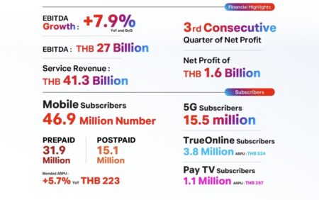 ทรู คอร์ปอเรชั่น รายงานผลกำไรสุทธิหลังหักภาษี (Net Profit After Tax) จำนวน 1.6 พันล้านบาท ในไตรมาส 3 ปี 2568 ซึ่งนับเป็นไตรมาสที่ 3 ติดต่อกันที่บริษัทฯ มีกำไรสุทธิ แม้รายได้รวมยังคงชะลอตัวจากผลกระทบทางเศรษฐกิจ แต่ผลกำไรได้รับประโยชน์จากการได้มาซึ่งใบอนุญาตให้ใช้คลื่นความถี่