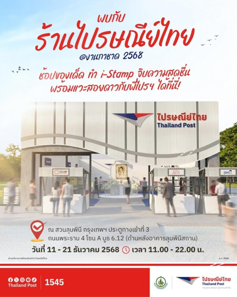 พบกันที่ร้านไปรษณีย์ในงานกาชาด และร่วมกิจกรรมรับโปรโมชันพิเศษมากมาย พร้อมอุดหนุนสลากกาชาดไปรษณีย์ มีสิทธิ์ลุ้นโชครางวัลใหญ่ ยิ่งซื้อมากยิ่งมีสิทธิ์มาก ระหว่างวันที่ 11 – 21ธันวาคม 2568 ตั้งแต่เวลา 11.00 – 22.00 น. ณ สวนลุมพินี