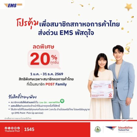 นอกจากนี้ ไปรษณีย์ไทยยังตอกย้ำบทบาทในฐานะพันธมิตรด้านโลจิสติกส์ ที่ช่วยขับเคลื่อนการค้าและธุรกิจไทยในทุกระดับผ่านโปรคุ้มเพื่อสมาชิกสภาหอการค้าไทยส่งด่วน EMS พัสดุใจ มอบส่วนลดพิเศษ 20% ทุกชิ้นตลอดทั้งปี ตั้งแต่วันนี้ จนถึงวันที่ 31ธันวาคม 2569 สำหรับสมาชิกหอการค้าไทยที่เป็นสมาชิก POST Family เพื่อเสริมศักยภาพผู้ประกอบการ SMEs และภาคธุรกิจในการจัดส่งสินค้าอย่างมีประสิทธิภาพ เพียงกดรับโค้ดส่วนลดผ่าน Line OA : หอการค้าไทย และแสดงโค้ดส่วนลดต่อเจ้าหน้าที่รับฝากทุกครั้งที่ใช้สิทธิ์