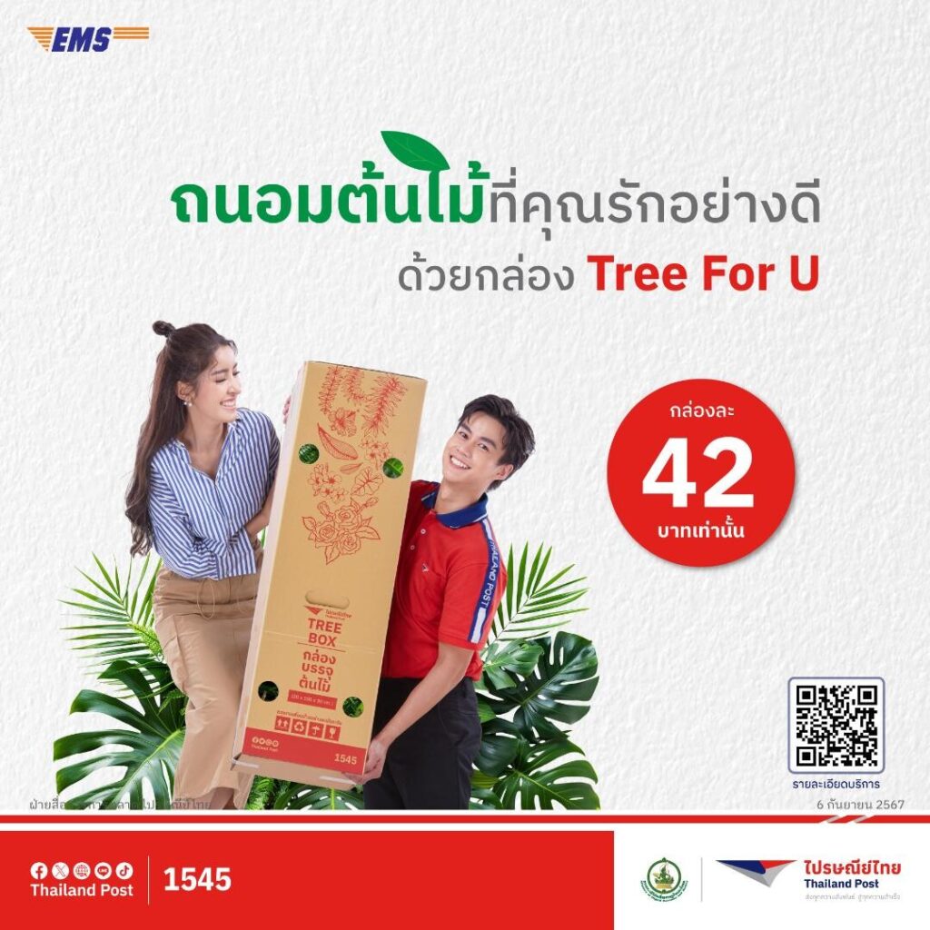 ไปรษณีย์ไทย นอกจากจะมุ่งมั่นสนับสนุนให้ทุกคนมีส่วนร่วมในการดูแลสิ่งแวดล้อม ยังพร้อมเป็นผู้ให้บริการขนส่ง (ส่งต่อ) ความสุขให้โลก เพิ่มโลกที่น่าอยู่ ด้วยบริการ EMS ส่งต้นไม้ ทั่วไทย ส่งด่วนถึงปลายทางภายใน 1 – 2 วัน อัตราค่าบริการพิเศษ เริ่มต้นเพียง 65บาท (สำหรับขนาดไม่เกิน 2 กิโลกรัม) สามารถเลือกซื้อ กล่อง Tree For U กล่องถนอมต้นไม้อย่างดี ด้วยความแข็งแรง ทนทาน มีความหนาถึง 5 ชั้น ที่จะช่วยดูแลต้นไม้ ของทุกคนในทุกเส้นทางทั่วไทย สามารถส่งต้นไม้ได้สูงสุด 30 กิโลกรัม ความสูงได้ถึง 140 ซม. ในราคาเพียงกล่องละ 42 บาทเท่านั้น