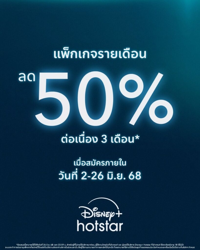 วิธีการสมัครแพ็กเกจลด 50% ต่อเนื่อง 3 เดือน สามารถสมัครตรงทางเว็บไซต์ได้ง่าย ๆ ที่ www.disneyplushotstar.com โดยกด “สมัครเลย” จากนั้นเลือกเข้าสู่ระบบด้วยเบอร์มือถือ (ได้ทุกเครือข่าย) หรือสแกน QR Code หากคุณล็อกอินบนมือถืออยู่แล้ว เพียงกรอกข้อมูลให้ครบ เลือกแพ็กเกจที่ต้องการ และชำระเงินผ่านบัตรเครดิตหรือบัตรเดบิต / บัตรเสมือน (เช่น TrueMoney Virtual Card, K Online Debit, SCB Prepaid Card, Krungthai FUN Debit Card) เพียงเท่านี้ก็พร้อมสตรีมคอนเทนต์คุณภาพแบบจุใจได้ทันที เริ่มสมัครได้ตั้งแต่วันที่ 2 มิถุนายน เวลา 11:30 น. ถึงวันที่ 26 มิถุนายน 2568 เวลา 23:59 น. (เวลาประเทศไทย) เท่านั้น