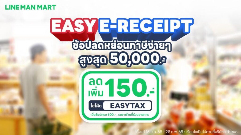 โครงการ Easy E-Receipt 2.0 บน LINE MAN MART เป็นการต่อยอดกระแสตอบรับที่ดีจากปีที่ผ่านมา ช่วยอำนวยความสะดวกให้ผู้ใช้ไม่พลาดโอกาสใช้สิทธิลดหย่อนภาษี นอกจากนี้ LINE MAN ยังมอบส่วนลดพิเศษให้กับทุกคนเพียงกรอกโค้ด EASYTAX รับส่วนลดเพิ่มทันที! สูงสุด 20% ใช้ได้ทั้งลูกค้าเก่าและลูกค้าใหม่ เมื่อสั่งขั้นต่ำ 600 บาท เริ่มวันที่ 16 มกราคม ถึง 28 กุมภาพันธ์ 2568