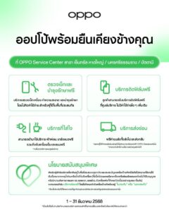 OPPO ยังได้จัดบริการหลังการขายพิเศษ เพื่อให้ความช่วยเหลือแก่ผู้ใช้งานที่ได้รับผลกระทบจากสถานการณ์น้ำท่วม โดยเปิดให้บริการตรวจเช็ก ทำความสะอาด และบำรุงรักษาเครื่องโดยไม่มีค่าใช้จ่าย พร้อมทั้งบริการติดฟิล์มฟรี และการซ่อมแซมอุปกรณ์ที่เสียหายจากเหตุการณ์น้ำท่วม โดยสามารถใช้บริการส่งซ่อมผ่านศูนย์บริการที่ร่วมรายการ ได้แก่ OPPO Service Center เซ็นทรัลหาดใหญ่, นครศรีธรรมราช และปัตตานี โดยบริการพิเศษนี้เปิดให้บริการตั้งแต่วันที่ 1 – 31 ธันวาคม 2568 ออปโป้ ประเทศไทย ขอส่งกำลังใจให้ทุกชุมชนในภาคใต้ผ่านพ้นสถานการณ์ และกลับสู่วิถีชีวิตปกติได้โดยเร็ว