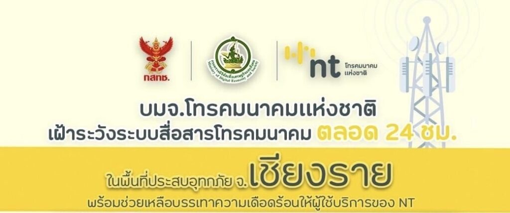 NT พร้อมเฝ้าระวังระบบสื่อสารโทรคมนาคม ตลอด 24 ชม.ในพื้นที่ประสบอุทกภัย จ.เชียงราย พร้อมช่วยเหลือบรรเทาความเดือดร้อนให้ผู้ใช้บริการของ NT โดยลูกค้าในพื้นที่ประสบภัย จ.เชียงราย ได้รับสิทธิ์ทันที