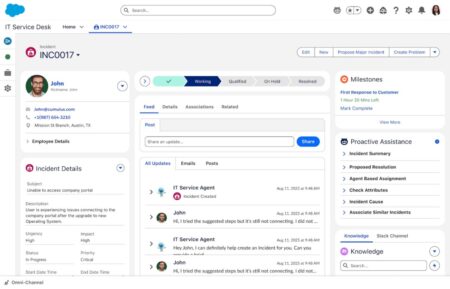- การจัดการสถานการณ์แบบอัตโนมัติ (Automated Incident Management): Agentforce สามารถสร้างและจัดลำดับความสำคัญของเหตุการณ์โดยอัตโนมัติจากรายงานของบุคลากร หากมีบุคลากรหลายคนรายงานปัญหา VPN ระบบจะตรวจจับว่าปัญหานี้เป็นปัญหาที่เกิดขึ้นในวงกว้าง และทำการยกระดับเป็นสถานการณ์เร่งด่วนทันที