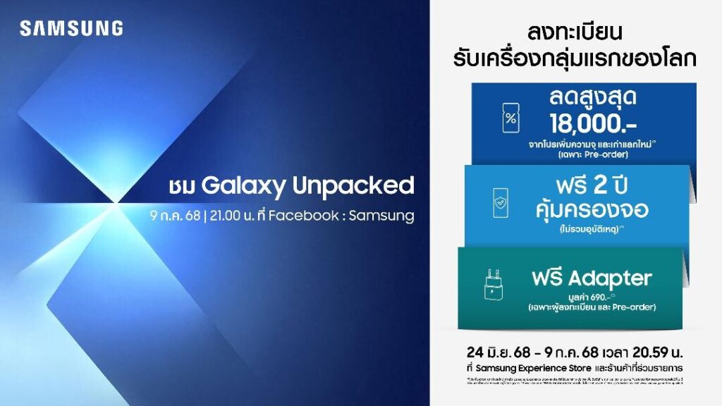 Final call นับถอยหลังสู่โค้งสุดท้าย ก่อน ‘บาง’ อย่างกำลังจะมา! โอกาสในการเป็นเจ้าของ The new Galaxy กลุ่มแรกของของโลก ลงทะเบียนถึงวันพรุ่งนี้เท่านั้น! พิเศษ! ลงทะเบียนวันนี้เพื่อรับสิทธิ์ในการเป็นสัมผัส The new Galaxy ก่อนใคร พร้อมโปรฯ ฟรีคุ้มครองจอ 2 ปี ใช้งานอุ่นใจหายห่วง และสิทธิพิเศษสุดคุ้มจากซัมซุง เริ่มลงทะเบียนฟรี ที่ https://bit.ly/PR-release-250624 ตั้งแต่วันนี้ – 9 กรกฎาคม 2568 ที่ Samsung Experience Store และร้านค้าที่ร่วมรายการ