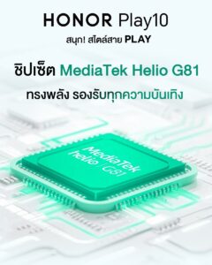 นอกจากนี้ HONOR ยังเตรียมเปิดตัวสมาร์ตโฟนอีกรุ่นที่น่าจับตามองอย่างHONOR Play 10 มาพร้อมคอนเซ็ปต์ ‘สนุก สไตล์สายเพล์’ ซึ่งออกแบบมาเพื่อตอบโจทย์ผู้ใช้งานที่มองหาความคุ้มค่าและประสิทธิภาพการใช้งานในชีวิตประจำวัน โดดเด่นด้วยแบตเตอรี่ขนาดใหญ่ 5,000mAh ชาร์จไว 10W พร้อมหน้าจอขนาดใหญ่ 6.74 นิ้ว ให้ภาพคมชัดและลื่นไหลด้วย อัตรารีเฟรช 90Hz เพิ่มอรรถรสทั้งการรับชมคอนเทนต์และการใช้งานทั่วไป ด้านประสิทธิภาพ HONOR Play 10 มาพร้อมชิปเซ็ต MediaTek Helio G81 แบบ Octa-core ช่วยให้การประมวลผลเป็นไปอย่างรวดเร็วและเสถียร รองรับการใช้งานหลากหลายรูปแบบ ทั้งการสื่อสาร ความบันเทิง และการใช้งานในชีวิตประจำวันได้อย่างลงตัว