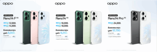 - สำหรับลูกค้าที่ซื้อ OPPO Reno14 Pro 5G จะได้รับของสมนาคุณมูลค่าสูงสุด 12,250 บาท E-VIP ประกันจอแตกจำนวน 1 ครั้ง ภายในระยะเวลา 1 ปีและประกันในพื้นที่เอเชีย-แปชิฟิก (นับจากวันที่ซื้อเครื่อง ผลบังคับใช้1 ปี) มูลค่า 10,000 บาท และสิทธิ์ Google AI Pro ฟรี 3 เดือน มูลค่า 2,250 บาท