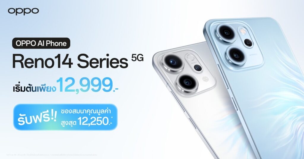 ห้ามพลาด! รีบไปเป็นเจ้าของ OPPO Reno14 Series 5G พร้อมรับทันทีของสมนาคุณสุดพิเศษ ได้ที่ OPPO Brand Shop และตัวแทนจำหน่ายที่ร่วมรายการทั่วประเทศ ตั้งแต่วันที่ 1-30 กันยายน 2568 นี้เท่านั้น