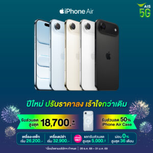 AIS มอบความสุขส่งท้ายปีเก่าต้อนรับปีใหม่ จัดเต็มโปรโมชันสุดร้อนแรง! ขนกองทัพสมาร์ทโฟนและอุปกรณดีไวซ์ครบทุกแบรนด์ ทั้ง iOS และ Android ให้ลูกค้าเป็นเจ้าของเครื่องใหม่ในราคาสุดคุ้ม เลือกได้ทั้ง “เครื่องพร้อมแพ็กเกจ” หรือ “เครื่องเปล่าไม่ติดสัญญา” ไฮไลต์เริ่มที่ iPhone Air ลดรวมสูงสุด 18,700 บาท เครื่องเปล่าเริ่ม 32,900 บาท หรือเครื่องพร้อมแพ็กเกจเริ่ม26,200 บาท พร้อมรับส่วนลด iPhone Air Case สูงสุด 50% ตั้งแต่วันนี้ – 13 มกราคม 2569 ที่ AIS Shop ทุกสาขา