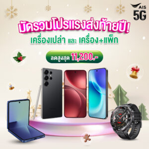 ขณะที่ฝั่ง Android ก็แรงไม่แพ้กัน นำโดย Samsung Galaxy S25 Ultra เครื่องเปล่าเริ่ม 46,900 บาท ลดทันที 10,000 บาท,Samsung Galaxy S25+ | S25 เครื่องพร้อมแพ็กเกจเริ่ม 17,900 บาท หรือเครื่องเปล่าเริ่ม 29,900 บาท ลดทันที 9,000 บาท, และ Samsung Galaxy Z Flip7 เครื่องพร้อมแพ็กเกจเริ่ม 29,700 บาท หรือเครื่องเปล่าเริ่ม 40,900 บาท ลดทันที 8,000 บาท แถม ฟรีกระเป๋า Aristotle และ AIS Care+ with Samsung Care Services ฟรี 1 ปี เสริมด้วยดีลสายแก็ดเจ็ต Huawei Watch ลดสูงสุด 4,400 บาท และโปร แลก AIS Points ลดหลักพัน สำหรับรุ่นฮิตอย่าง vivo X300 series, OPPO Find X9 series และ Redmi Note 14 series ตั้งแต่วันนี้ – 13 มกราคม 2569 ที่ AIS Shop ทุกสาขาเท่านั้น!