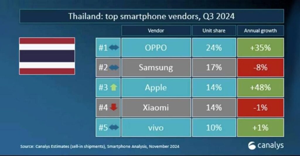 OPPO ประสบความสำเร็จอย่างท่วมท้นในตลาดสมาร์ตโฟนไทย จากรายงานของ Canalys แบรนด์อุปกรณ์อัจฉริยะชั้นนำ OPPO มีอัตราการเติบโตเฉลี่ยต่อปีเพิ่มขึ้นถึง 35% ยังคงครองตำแหน่งแบรนด์สมาร์ตโฟนยอดจำหน่ายอันดับ 1 ของประเทศไทยในไตรมาส 3 ปี 2567 OPPO ประสบความสำเร็จหลังบุกเข้าตลาดสมาร์ตโฟน AI อย่างเต็มรูปแบบด้วยการเปิดตัว AI Phone เครื่องแรกที่ดีที่สุดสำหรับคนรุ่นใหม่ มอบประสบการณ์ใช้งาน AI เต็มรูปแบบกับ OPPO Reno12 Series 5G ด้วยกระแสตอบรับที่ดีเกินคาด ผลักดันให้ OPPO เติบโตอย่างรวดเร็ว