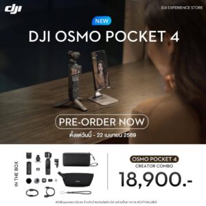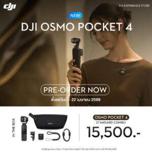 • The Osmo Pocket 4 Standard Combo retails for 15,500 THB. It includes the Osmo Pocket 4, USB-C to USB-C PD Cable (USB 3.1), Osmo Pocket 4 Gimbal Clamp, DJI Wrist Strap, Osmo Pocket 4 Handle with 1/4″ Thread, and Osmo Pocket 4 Portable Carrying Pouch.